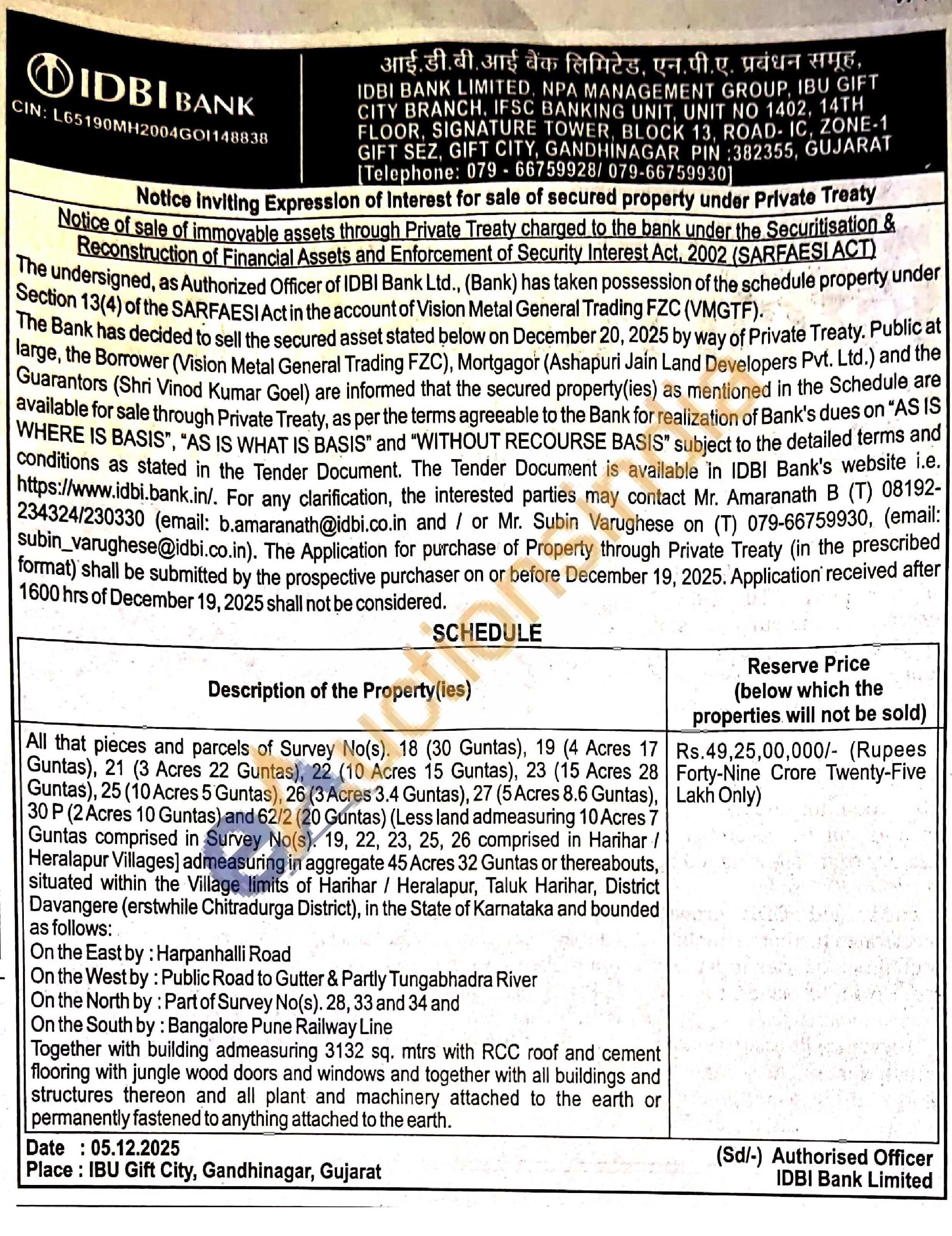 All that pieces and parcels of Survey No(s). 18 (30 Guntas), 19 (4 Acres 17 Guntas), 21 (3 Acres 22 Guntas), 22 (10 Acres 15 Guntas), 23 (15 Acres 28 Guntas), 25 (10 Acres 5 Guntas), 26 (3 Acres 3.4 Guntas), 27 (5 Acres 8.6 Guntas), 30 P (2 Acres 10 Guntas) and 62/2 (20 Guntas) (Less land admeasuring 10 Acres 7 Guntas comprised in Survey No(s). 19, 22, 23, 25, 26 comprised in Harihar /Heralapur Villages] admeasuring in aggregate 45 Acres 32 Guntas or thereabouts, situated within the Village limits of Harihar / Heralapur, Taluk Harihar, District Davangere (erstwhile Chitradurga District), in the State of Karnataka and bounded as follows: On the East by: Harpanhalli Road On the West by: Public Road to Gutter & Partly Tungabhadra River On the North by: Part of Survey No(s). 28, 33 and 34 and On the South by: Bangalore Pune Railway Line Together with building admeasuring 3132 sq. mtrs with RCC roof and cement flooring with jungle wood doors and windows and together with all buildings and structures thereon and all plant and machinery attached to the earth or permanently fastened to anything attached to the earth.