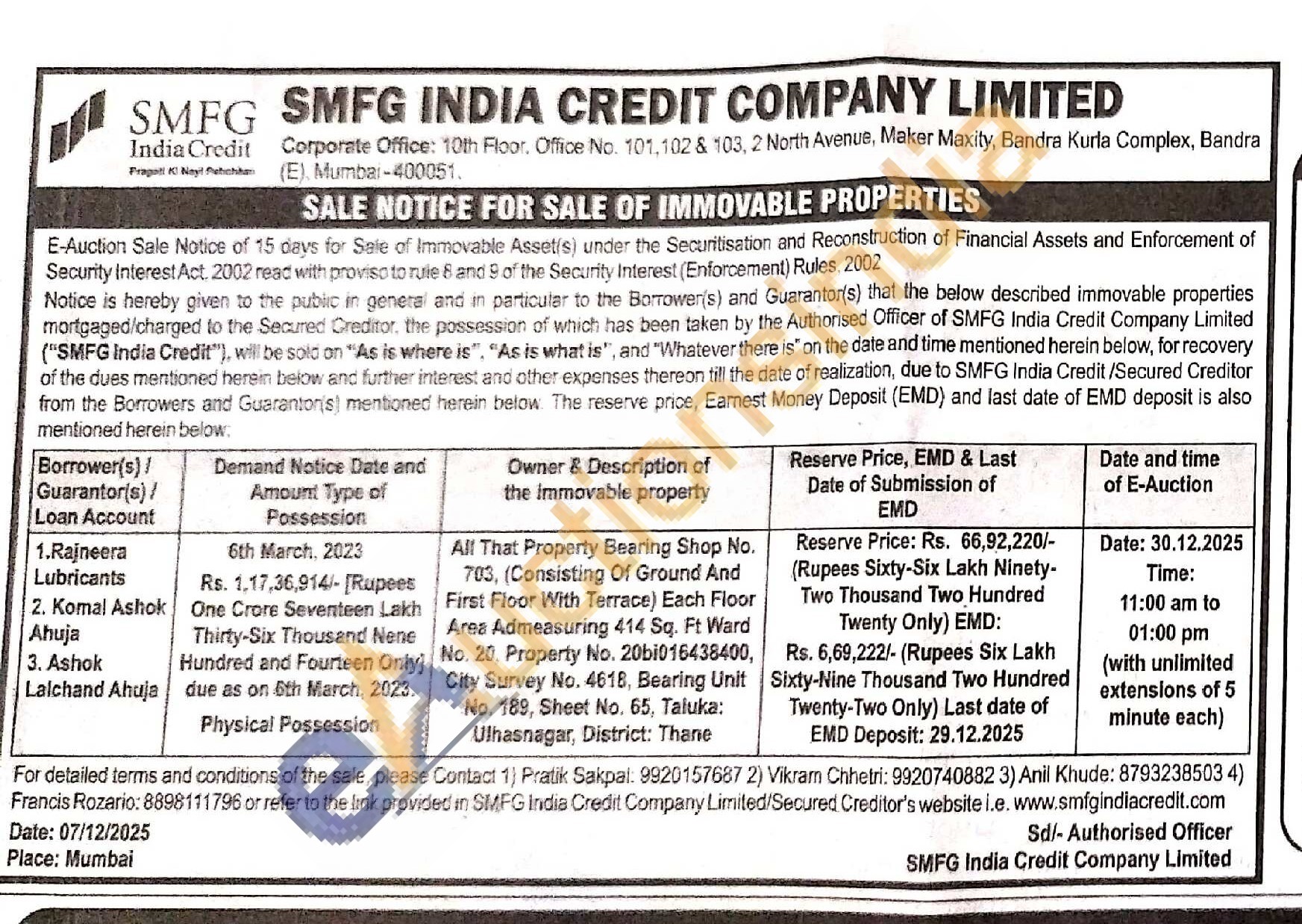 All That Property Bearing Shop No. 703, (Consisting Of Ground And First Floor With Terrace) Each Floor Area Admeasuring 414 Sq. Ft Ward No. 20, Property No. 20bi016438400, City Survey No. 4618, Bearing Unit No. 189, Sheet No. 65, Taluka: Ulhasnagar, District: Thane