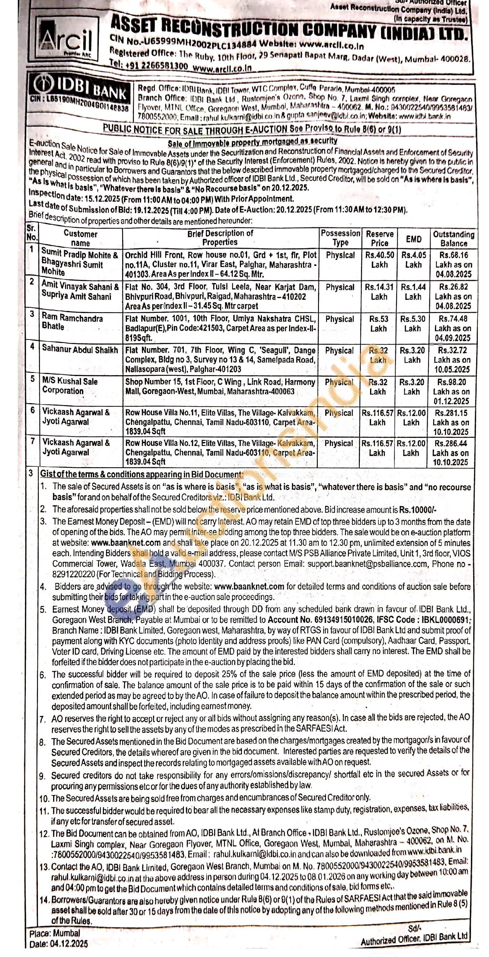 Flat Number. 1001, 10th Floor, Umiya Nakshatra CHSL, Badlapur(E), Pin Code: 421503, Carpet Area as per Index-II-819Sqft.