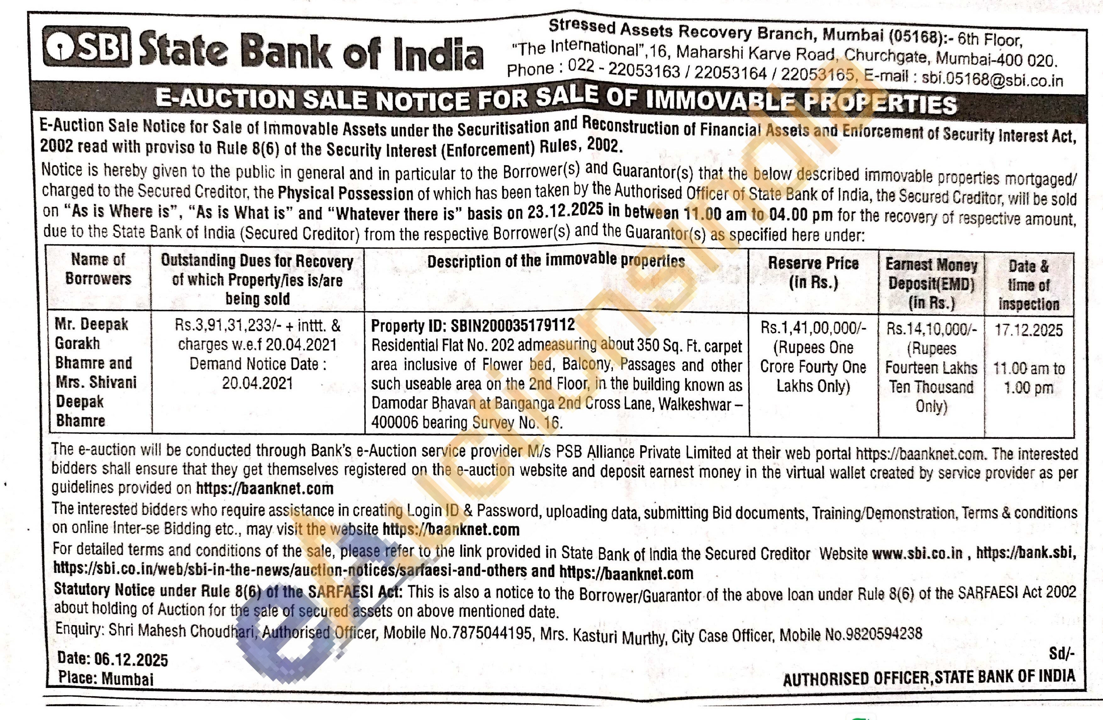 Shri Mahesh Choudhari, Authorised Officer, Mobile No.7875044195, Mrs. Kasturi Murthy, City Case Officer, Mobile No.9820594238