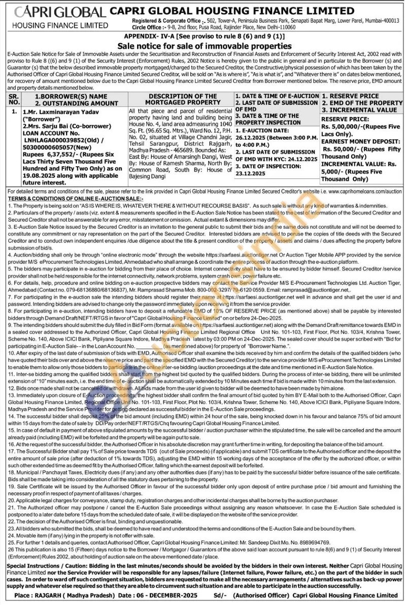 All that piece and parcel of residential property having land and building being House No. 4, land area admeasuring 1040 Sq. Ft. (96.65 Sq. Mtrs.), Ward No. 12, P.H. No. 02, situated at Village Chandni Jagir, Tehsil Sarangpur, District Rajgarh, Madhya Pradesh-465689. Bounded As: East By: House of Amarsingh Dangi, West By: House of Ramesh Sharma, North By: Common Road, South By: House of Bajesing Dangi