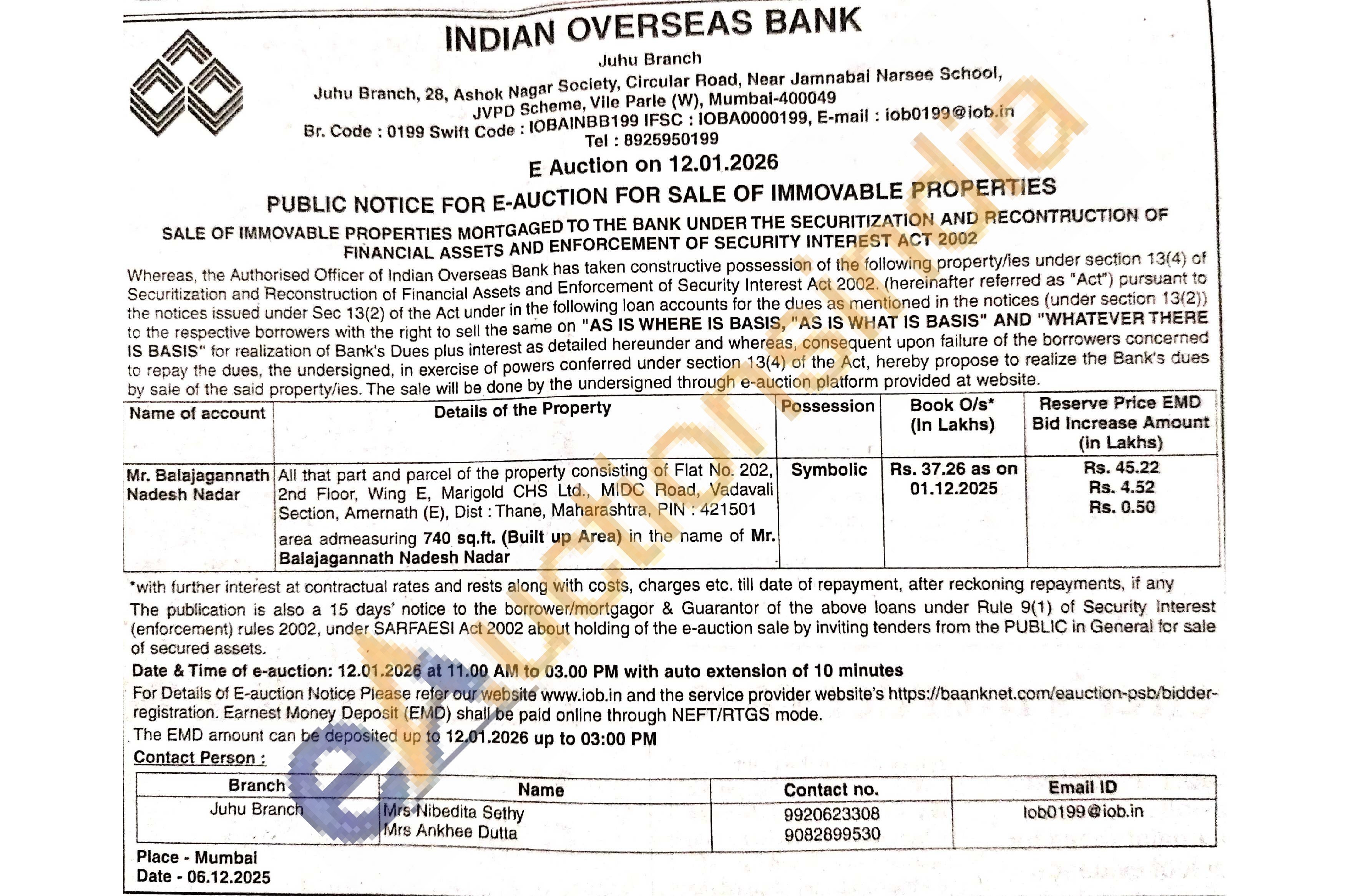 All that part and parcel of the property consisting of Flat No. 202, 2nd Floor, Wing E, Marigold CHS Ltd., MIDC Road, Vadavali Section, Amernath (E), Dist: Thane, Maharashtra, PIN: 421501 area admeasuring 740 sq.ft. (Built up Area) in the name of Mr. Balajagannath Nadesh Nadar
