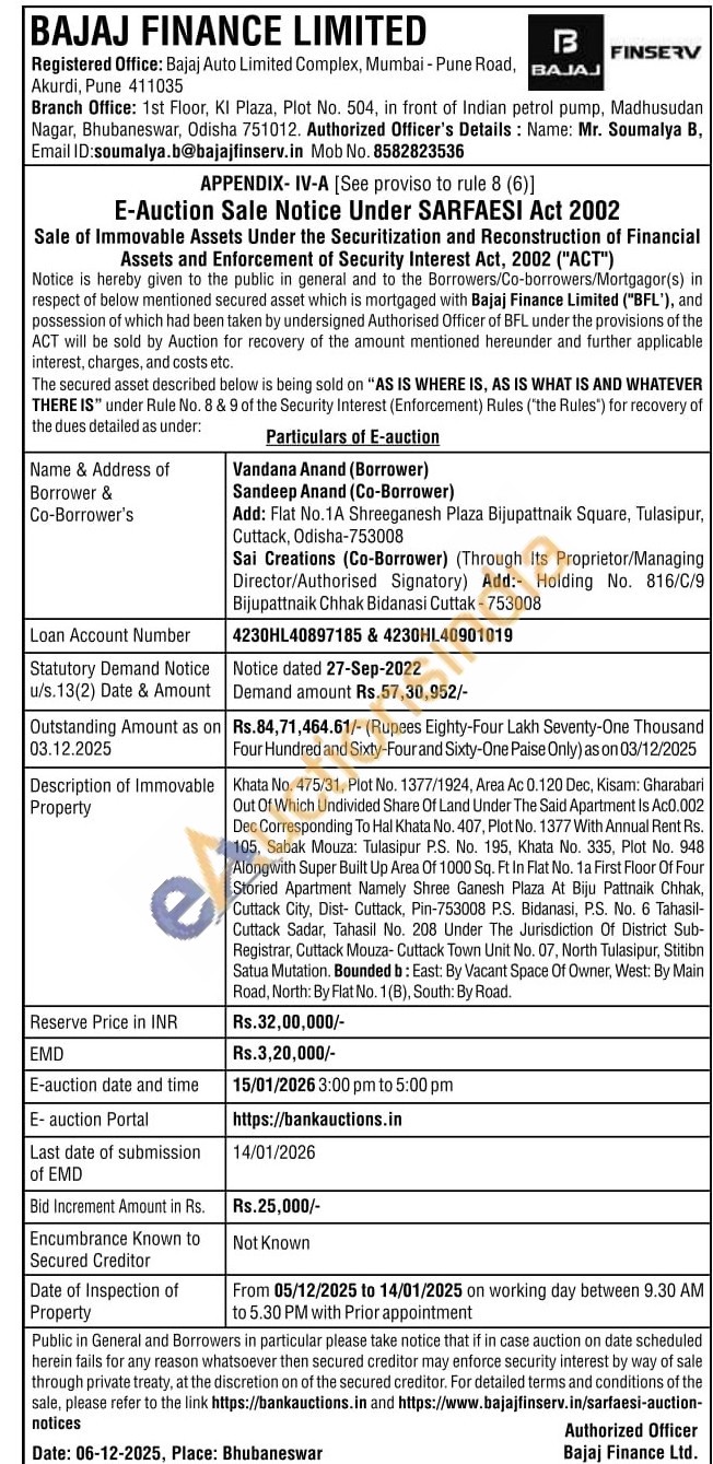 Khata No. 475/31, Plot No. 1377/1924, Area Ac 0.120 Dec, Kisam: Gharabari Out Of Which Undivided Share Of Land Under The Said Apartment Is Ac0.002Dec Corresponding To Hal Khata No. 407, Plot No. 1377 With Annual Rent Rs. 105, Sabak Mouza: Tulasipur P.S. No. 195, Khata No. 335, Plot No. 948 Alongwith Super Built Up Area Of 1000 Sq. Ft In Flat No. 1a First Floor Of Four Storied Apartment Namely Shree Ganesh Plaza At Biju Pattnaik Chhak, Cuttack City, Dist- Cuttack, Pin-753008 P.S. Bidanasi, P.S. No. 6 Tahasil-Cuttack Sadar, Tahasil No. 208 Under The Jurisdiction Of District Sub-Registrar, Cuttack Mouza- Cuttack Town Unit No. 07, North Tulasipur, Stitibn Satua Mutation. Bounded b: East: By Vacant Space Of Owner, West: By Main Road, North: By Flat No. 1(B), South: By Road.