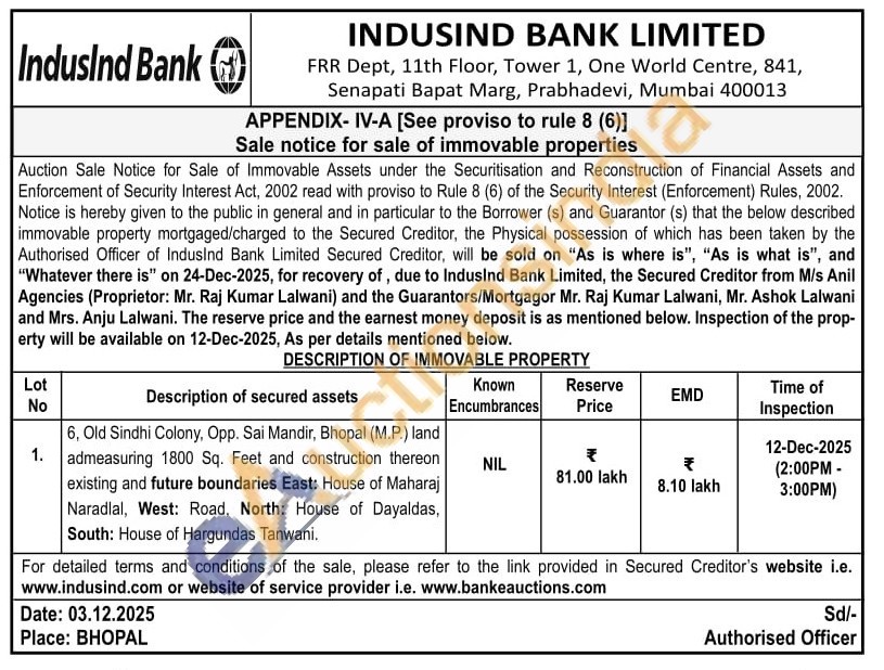 6, Old Sindhi Colony, Opp. Sai Mandir, Bhopal (M.P.) land admeasuring 1800 Sq. Feet and construction thereon existing and future boundaries East: House of Maharaj Naradlal, West: Road, North: House of Dayaldas, South: House of Hargundas Tanwani.