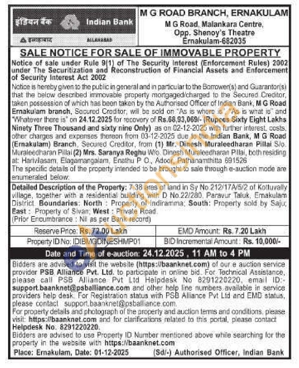 Detailed Description of the Property: 7.38 ares of land in Sy No 212/17A/5/2 of Kottuvally village, together with a residential building with D No.22/280, Paravur Taluk, Emakulam District Boundaries: North Property of Indiramma; South: Property sold by Saju; East: Property of Sivan; West: Private Road. (Prior Encumbrance: Nil as per Bank record
