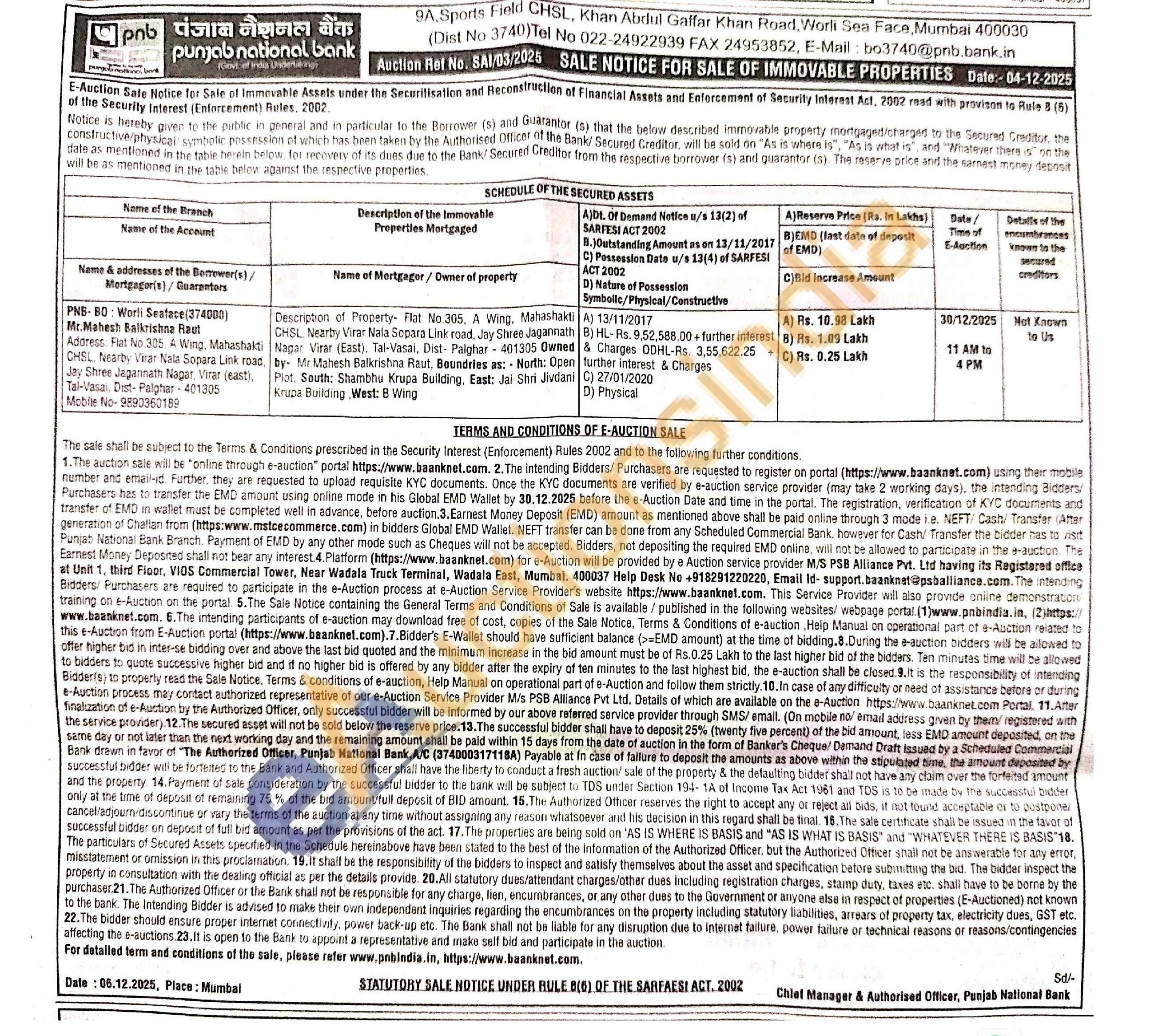 Description of Property Flat No.305, A Wing. Mahashakti CHSL Nearby Virar Nala Sopara Link road, Jay Shree Jagannath Nagar Virar (East). Tal-Vasai, Dist- Palghar 401305 Owned by Mr. Mahesh Balkrishna Raut, Boundries as: North: Open Plot. South: Shambhu Krupa Building, East: Jai Shri Jivdani Krupa Building West: B Wing