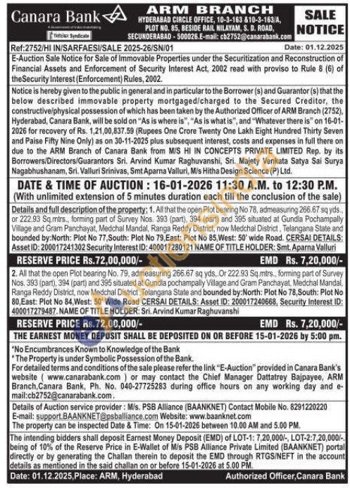 All that the open Plot bearing No. 79, admeasuring 266.67 sq yds, Or 222.93 Sq.mtrs., forming part of Survey Nos. 393 (part), 394 (part) and 395 situated at Gundla pochampally Village and Gram Panchayat, Medchal Mandal. Ranga Reddy District, now Medchal District, Telangana State and bounded by:North: Plot No 78, South: Plot No 80, East: Plot No 84, West: 50' Wide Road CERSAI DETAILS: Asset ID: 200017240668, Security Interest ID: 400017279487. NAME OF TITLE HOLDER: Sri. Arvind Kumar Raghuvanshi