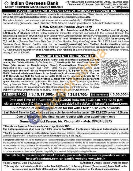 (Property Owned by Mr. Sumthi A Challani) All that piece and parcel of Land and Building bearing Sub Division Plot No. G. Old Door No. 17, New Door No 8-A, New Thandavarayan Street (also known as Thandavarayan Street), Purasawalkam, Chennai 600007, comprised in R.S Nos. 1538/1 and 1542/1, Block No 25, Purasawalkam Village, Land measuring an extent of 1674 Sq Feet undivided share in 3340 Sq Feet of Plot No G and 390 Sq feet undivided share interest in the Road area, in all measuring 2064 Sq. Feet out of 11 Grounds and 1840 Sq Feet (as per patta 25117 sq ft), together with Villa No 12, Ground, First and Second Floors on Plot No G, along with rights to parking in car parking space, Bounded on the North by Poonam First Lane, South by New Thandavarayan Street. East by Mosque Street, West by T N Slum Clearance Board Quarters within the Sub-Registration District of Puraswalkam and Registration District of Central Chennai. The above property is covered under sale deed no 3628/2014 registered at SRO Purasawalkam