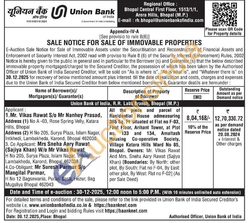 All the piece and parcel of Residential House admeasuring 365 Sq. Ft situated at Flat no F-03, First Floor, Arihant Tower, at Plot no. 133 and 134, Amaltash Housing Co-operative Society, Village Katara Hills Ward No 85, Bhopal. Owners: Mr. Vikas Rawat And Mrs. Sneha Aary Rawat (Sajiya Khan) [Boundaries: By North: other plot, By South: Flat no F-04, By East: other plot, By West: Flat no F-02] (As per Sale Deed)