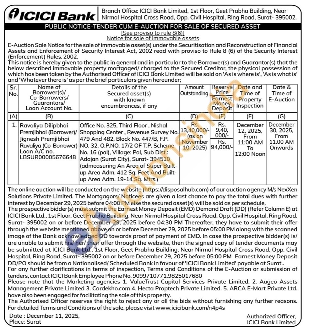 Office No. 325, Third Floor, Nishal Shopping Center, Revenue Survey No. 479 And 482, Block No. 447/B, F.P. NO. 32, Ο.Ρ.ΝΟ. 17/2 OF T.P. Scheme No. 16 (pal), Village: Pal, Sub Dist.: Adajan (Surat City), Surat-394510 (admeasuring An Area of Super Built-up Area Adm. 412 Sq. Feet And Built-up Area Adm. 19-14 Sq. Mtrs.)