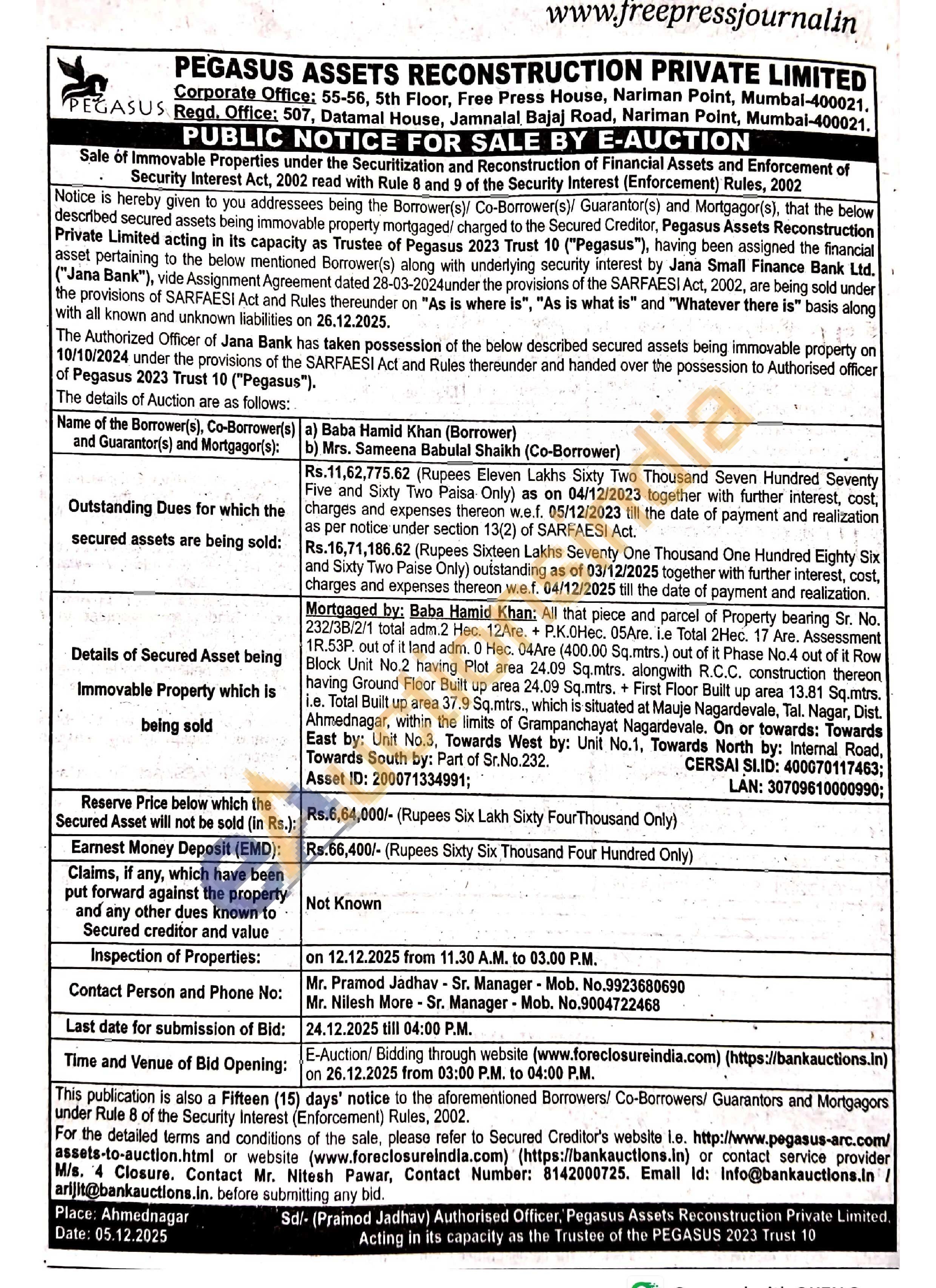 Mortgaged by: Baba Hamid Khan: All that piece and parcel of Property bearing Sr. No. 232/38/2/1 total adm.2 Hec. 12Are. + P.K.OHec. 05Are. i.e Total 2Hec. 17 Are. Assessment 1R.53P. out of it land adm. 0 Hec. 04Are (400.00 Sq.mtrs.) out of it Phase No.4 out of it Row Block Unit No.2 having Plot area 24.09 Sq.mtrs. alongwith R.C.C. construction thereon having Ground Floor Built up area 24.09 Sq.mtrs. + First Floor Built up area 13.81 Sq.mtrs. i.e. Total Built up area 37.9 Sq.mtrs., which is situated at Mauje Nagardevale, Tal. Nagar, Dist. Ahmednagar, within the limits of Grampanchayat Nagardevale. On or towards: Towards East by: Unit No.3, Towards West by: Unit No.1, Towards North by: Internal Road, Towards South by: Part of Sr.No.232.