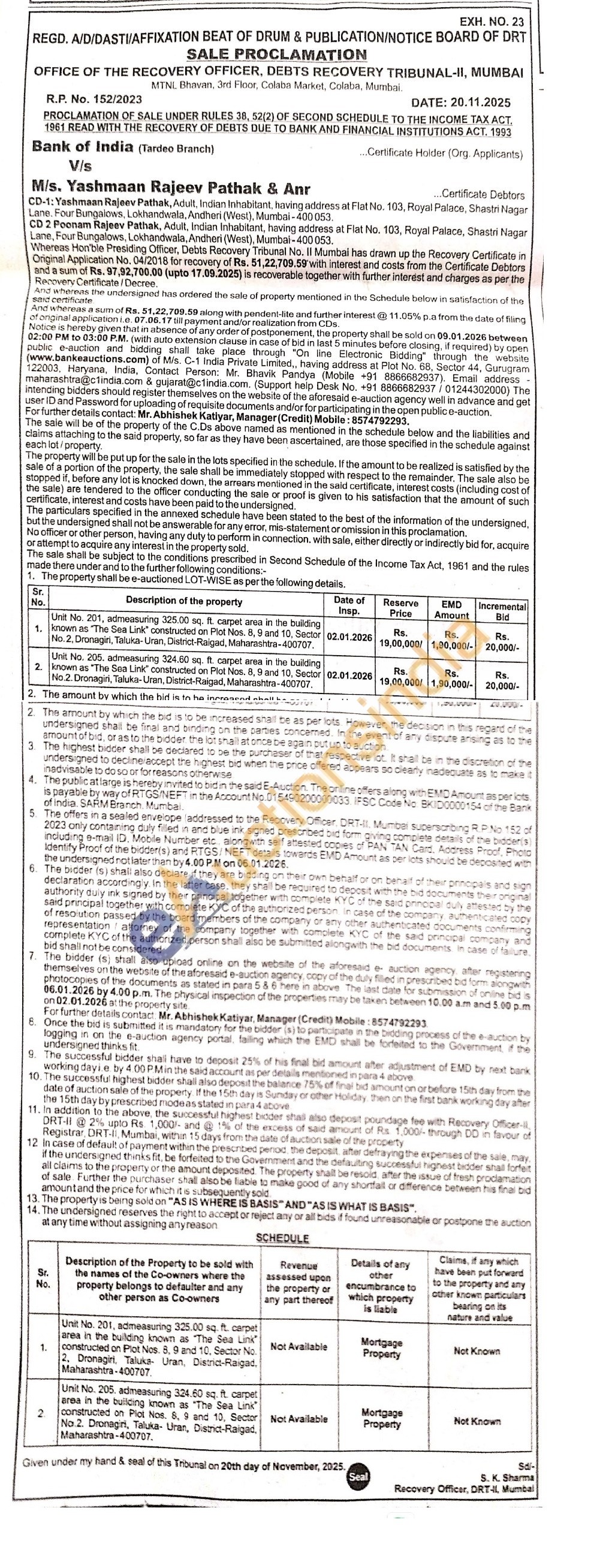 Unit No. 205. admeasuring 324.60 sq. ft. carpet area in the building known as "The Sea Link" constructed on Plot Nos. 8, 9 and 10, Sector No.2. Dronagiri, Taluka-Uran, District-Raigad, Maharashtra-400707