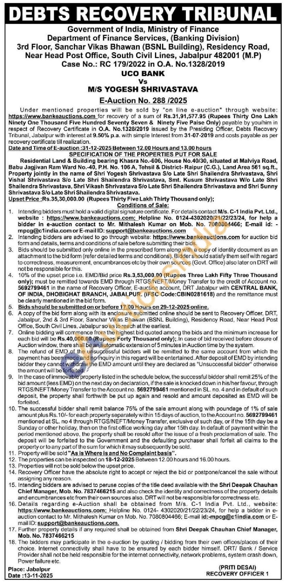 Residential Land & Building bearing Khasra No.-606, House No.40/30, situated at Malviya Road, Babu Jagjivan Ram Ward No.-40, P.H. No. 106 A, Tehsil & District-Raipur (C.G.), Land Area 561 sq.ft., Property jointly in the name of Shri Yogesh Shrivastava S/o Late Shri Shailendra Shrivastava, Shri Vishal Shrivastava S/o Late Shri Shailendra Shrivastava, Smt. Kusum Shrivastava W/o Late Shri Shailendra Shrivastava, Shri Vikash Shrivastava Sio Late Shri Shailendra Shrivastava and Shri Sunny Shrivastava S/o Late Shri Shailendra Shrivastava.