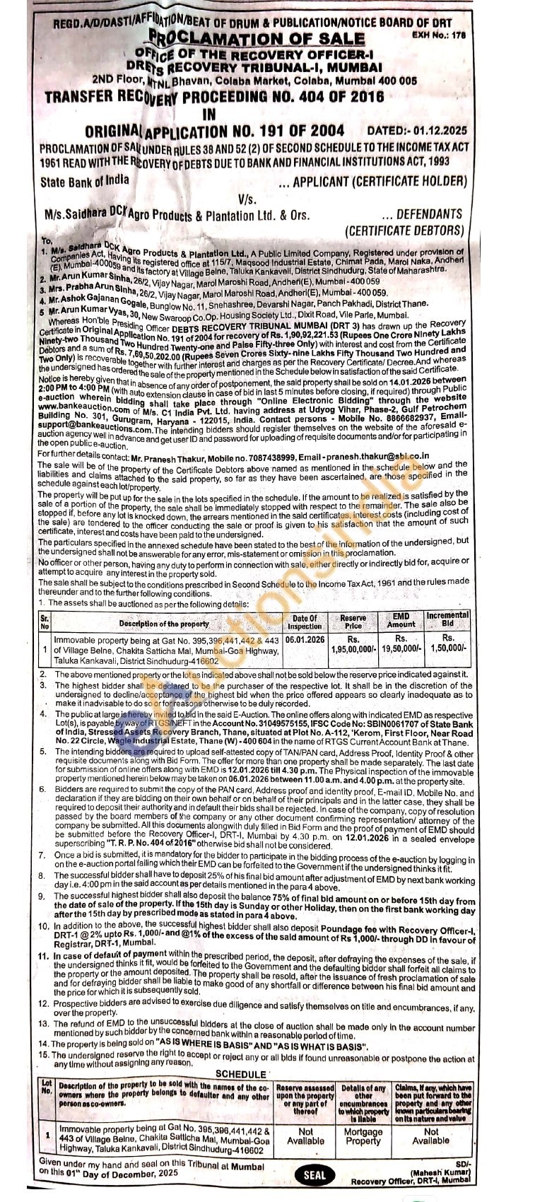 Immovable property being at Gat No. 395,396,441,442 & 443 of Village Belne, Chakita Satticha Mal, Mumbai-Goa Highway, Taluka Kankavali, District Sindhudurg-416602