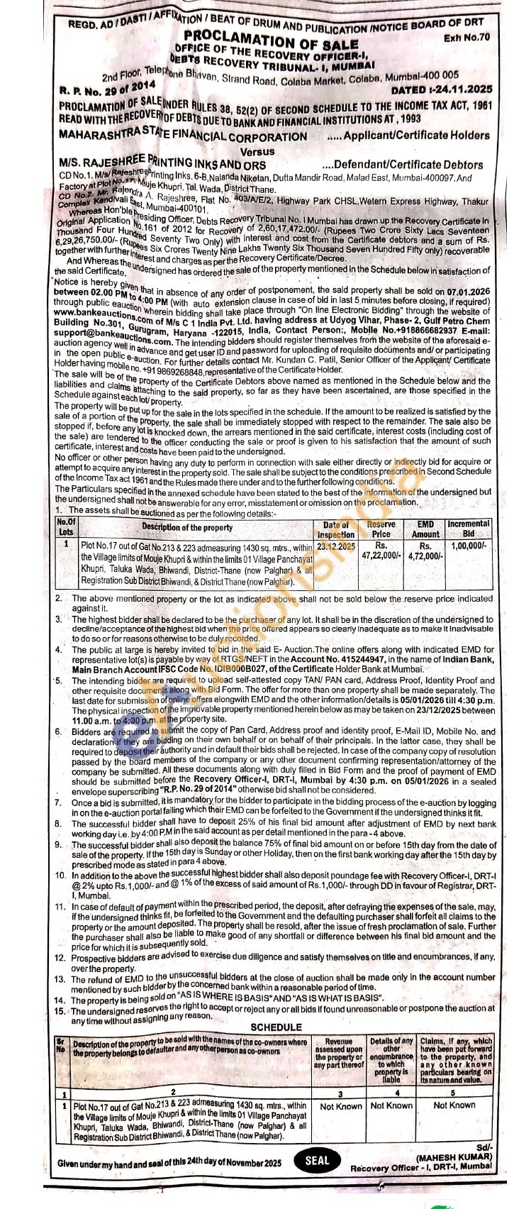Plot No.17 out of Gat No.213 & 223 admeasuring 1430 sq. mtrs., within the Village limits of Mouje Khupri & within the limits 01 Village Panchayat Khupri, Taluka Wada, Bhiwandi, District-Thane (now Palghar) & all Registration Sub District Bhiwandi, & District Thane (now Palghar