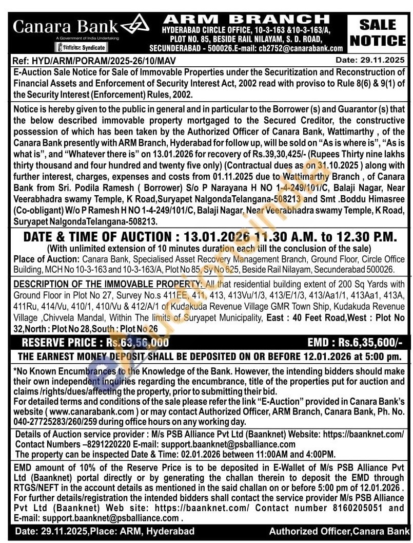 DESCRIPTION OF THE IMMOVABLE PROPERTY: All that residential building extent of 200 Sq Yards with Ground Floor in Plot No 27, Survey No.s 411EE, 411, 413, 413Vu/1/3, 413/E/1/3, 413/Aa1/1, 413Aa1, 413A, 411Ru, 414/Vu, 410/1, 410/Vu & 412/A/1 of Kudakuda Revenue Village GMR Town Ship, Kudakuda Revenue Village, Chivvela Mandal, Within The limits of Suryapet Municipality, East: 40 Feet Road, West: Plot No 32, North: Plot No 28, South: Plot No