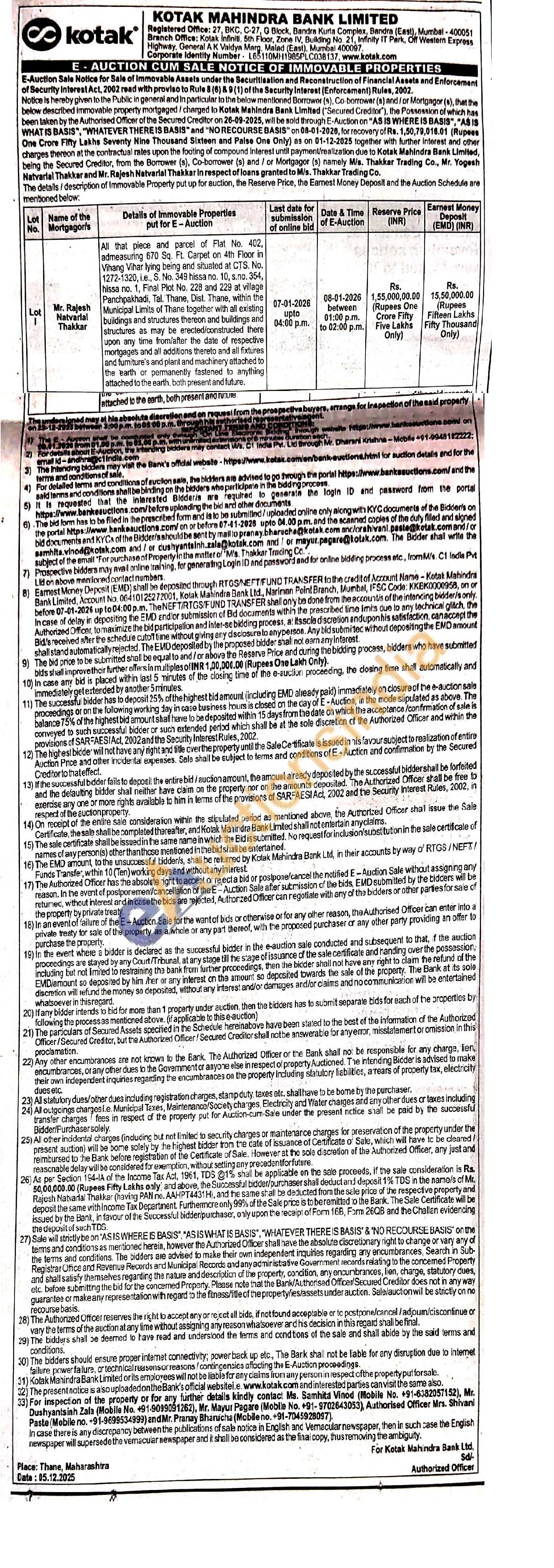Authorised Officer Mrs. Shivani Paste (Mobile no. +91-9699534999) and Mr. Pranay Bharucha (Mobile no. +91-7045928097