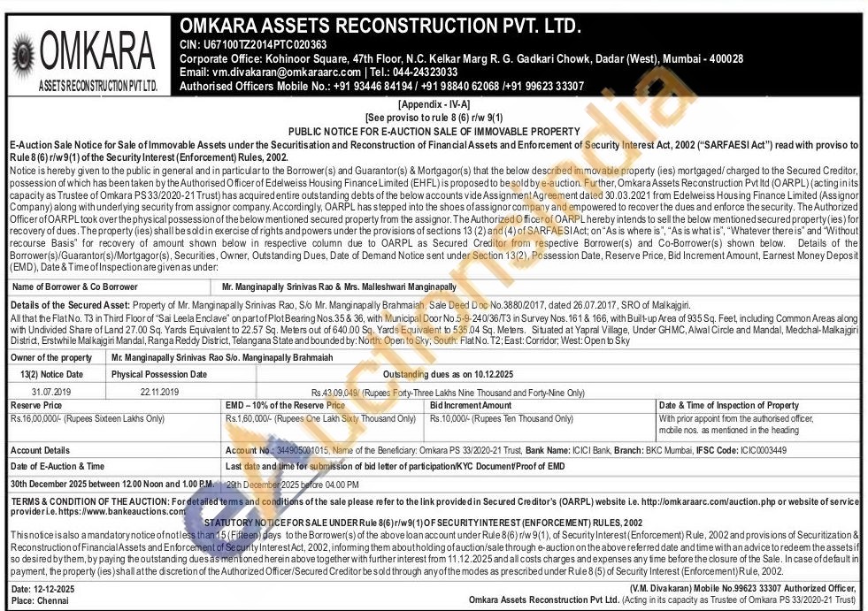 Details of the Secured Asset: Property of Mr. Manginapally Srinivas Rao, S/o Mr. Manginapally Brahmaiah, Sale Deed Doc No.3880/2017, dated 26.07.2017, SRO of Malkajgiri. All that the Flat No. T3 in Third Floor of "Sai Leela Enclave" on part of Plot Bearing Nos. 35 & 36, with Municipal Door No.5-9-240/36/T3 in Survey Nos. 161 & 166, with Built-up Area of 935 Sq. Feet, including Common Areas along with Undivided Share of Land 27.00 Sq. Yards Equivalent to 22.57 Sq. Meters out of 640.00 Sq. Yards Equivalent to 535.04 Sq. Meters. Situated at Yapral Village, Under GHMC, Alwal Circle and Mandal, Medchal-Malkajgiri District, Erstwhile Malkajgiri Mandal, Ranga Reddy District, Telangana State and bounded by: North: Open to Sky; South: Flat No. T2; East: Corridor, West: Open to Sky