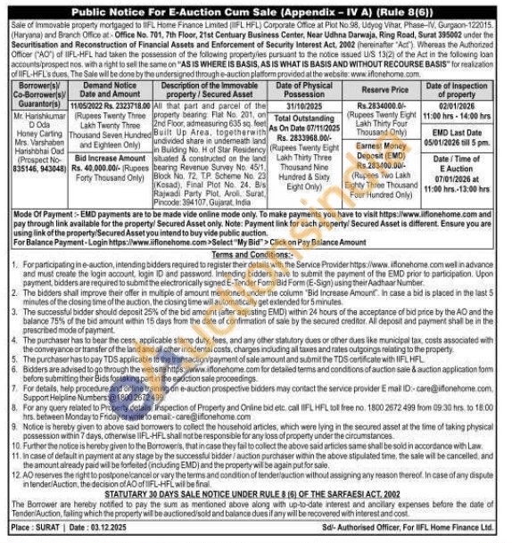 All that part and parcel of the property bearing Flat No. 201, on 2nd Floor, admisasuing 635 sq. fest Built Up Area, togetherwith undivided share in undemeath land in Building No. H of Star Residency situated & constructed on the land bearing Revenue Survey No. 45/1. Block No. 72, TP. Scheme No. 23 (Kosad), Final Plot No. 24. Bis Rajwadi Party Plot. Aroll, Surat Pincode: 384107, Gujarat, India