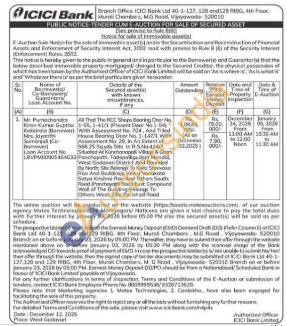 All That The RCC Shops Bearing Door No. 1-55, 1-41/1 (Present Door No.1-54) With Assessment No. 704, And Tilled House Bearing Door No. 1-147/1 With Assessment No. 29, In An Extent of 566.25 Sq.yds Site In R.S.No.414/7, Situated At Kunchanapalli Village & Gram Ponchayath, Tadepalligudem Mandal, West Godavari District And Bounded By North: Site Belongs To Koila Srinivasa Rao And Buddiraju Veera Venakata Satya Krishna Roo And Others South: Road (Panchayathi Road East: Compound Wall of The Building Belongs To Others West: Zilla Parishad Road