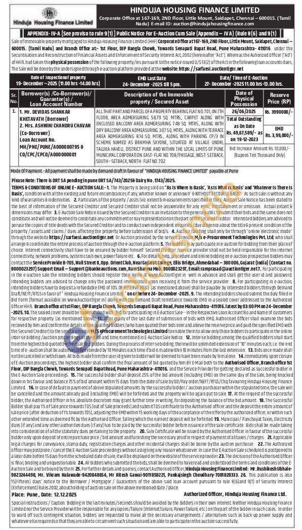 ALL THAT PART AND PARCEL OF A PROPERTY BEARING FLATINO 701, ON 7TH FLOOR, AREA ADMEASURING 5879 50 MTRS, CARPET ALONG WITH ENCLOSED BALCONY AREA ADMEASURING 748 SQ MERS, ALONG WITH DRY BALCONY AREA ADMEASURING 3075Q MTRS, ALONG WITH TERRACE AREA ADMEASURING 814 50 MTRS, ALONG WITH PARKING CP/3 IN SCHEME NAMED AS BRAMHA SKYONE, SITUATED AT VILLAGE UNDRU TALUKA HAVELL, DISTRICT PUNE AND WITHIN THE LOCAL LIMITS OF PUNE MUNICIPAL CORPORATION EAST-FLAT NO. 708/PASSAGE, WEST-SETBACK, SOUTH-SETBACK, NORTH-FLATINO 702