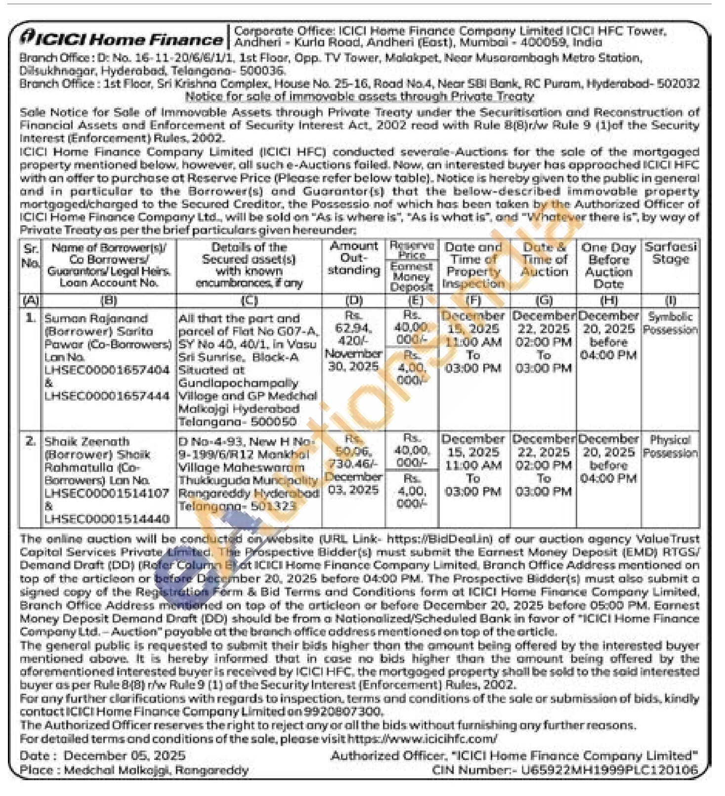 1)All that the part and parcel of Flat No G07-A, SY No 40, 40/1, in Vasu Sri Sunrise, Block-A Situated at Gundlapochampally Villoge and GP Medichal Malkajgi Hyderabad Telangana-500050