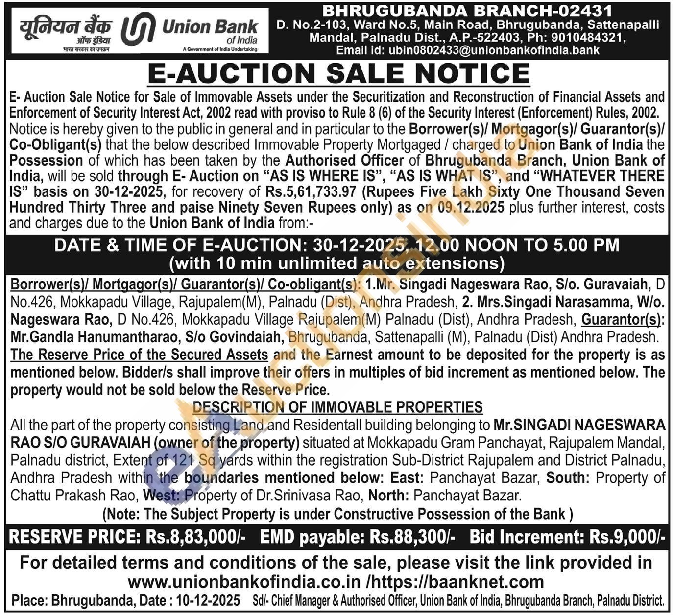 All the part of the property consisting Land and Residentall building belonging to Mr.SINGADI NAGESWARA RAO S/O GURAVAIAH (owner of the property) situated at Mokkapadu Gram Panchayat, Rajupalem Mandal, Palnadu district, Extent of 121 Sq yards within the registration Sub-District Rajupalem and District Palnadu, Andhra Pradesh within the boundaries mentioned below: East: Panchayat Bazar, South: Property of Chattu Prakash Rao, West: Property of Dr.Srinivasa Rao, North: Panchayat Bazar.