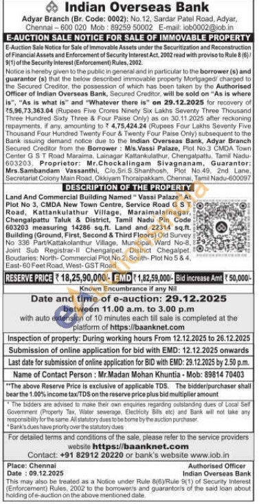 Land And Commercial Building Named Vassi Palaze" At Plot No 3, CMDA New Town Centre, Service Road GST Road, Kattankulathur Village. Maraimalainagar, Chengalpattu Taluk & District, Tamil Nadu Pin Code 603203 measuring 14286 sq.ft. Land and 22314 sq.ft. Building (Ground, First, Second & Third Floors) Old Survey No 336 Part Kattakolanthur Village, Municipal Ward No-8, 19 Joint Sub Registrar-II Chengalpet, District Chegalpet ORN Boudaries: North-Commercial Plot No 2, South-Plot No 5 & 4, East-60 Feet Road, West-GST Road