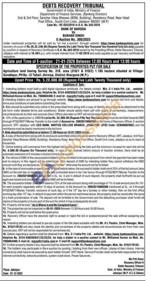Agriculture land having Survey No. 318, area (318/1 & 318/2) 1.185 hectare situated at Village-Gorakhpur, PH No.-37 Tehsil: Jhirniya, District: Khargone (M.P.).