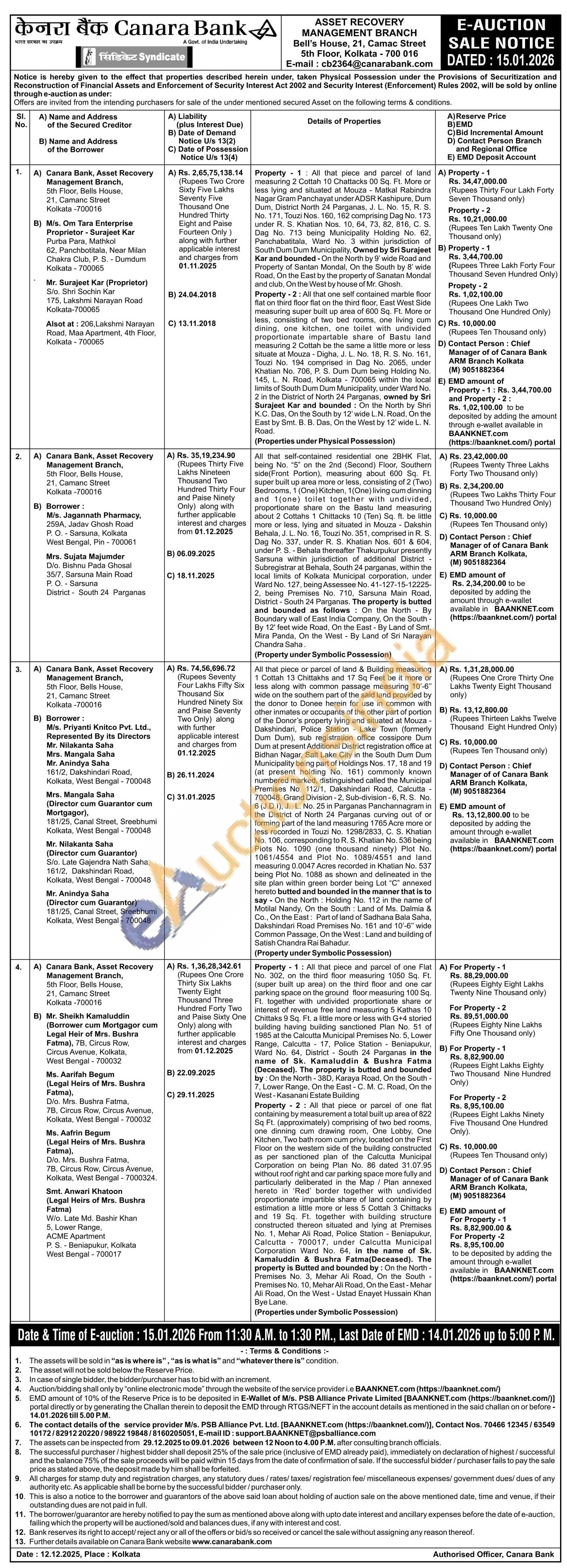 Property 2: All that piece or parcel of one flat containing by measurement a lotal built up area of 822 Sq Ft. (approximately) comprising of two bed rooms, one dinning cum drawing room, One Lobby, One Kitchen, Two bath room cum privy, located on the First Floor on the western side of the building constructed as per sanctioned plan of the Calcutta Municipal Corporation on being Plan No. 86 dated 31.07.95 without roof right and car parking space more fully and particularly deliberated in the Map / Plan annexed hereto in 'Red border together with undivided proportionate impartible share of land containing by estimation a little more or less 5 Cottah 3 Chittacks and 19 Sq. Ft. together with building structure constructed thereon situated and lying at Premises No. 1, Mehar Ali Road, Police Station-Beniapukur, Calcutta 700017, under Calcutta Municipal Corporation Ward No. 64, in the name of Sk. Kamaluddin & Bushra Fatma (Deceased). The property is Butted and bounded by: On the North-Premises No. 3, Mehar Ali Road, On the South-Premises No. 10, Mehar Ali Road, On the East-Mehar Ali Road, On the West-Ustad Enayet Hussain Khan Bye Lane (Properties under Symbolic Possession)
