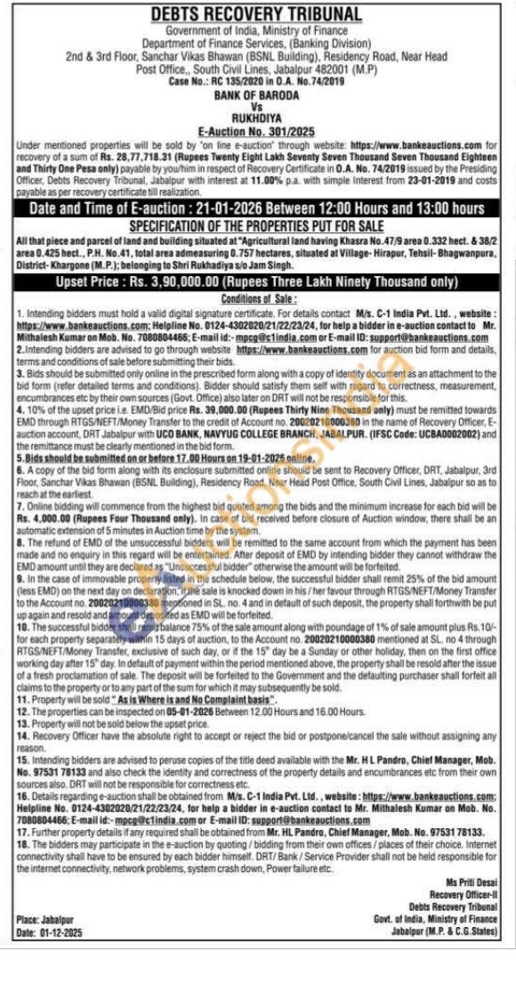 All that piece and parcel of land and building situated at "Agricultural land having Khasra No.47/9 area 0.332 hect. & 38/2 area 0.425 hect., P.H. No. 41, total area admeasuring 0.757 hectares, situated at Village-Hirapur, Tehsil-Bhagwanpura, District-Khargone (M.P.); belonging to Shri Rukhadiya s/o Jam Singh.
