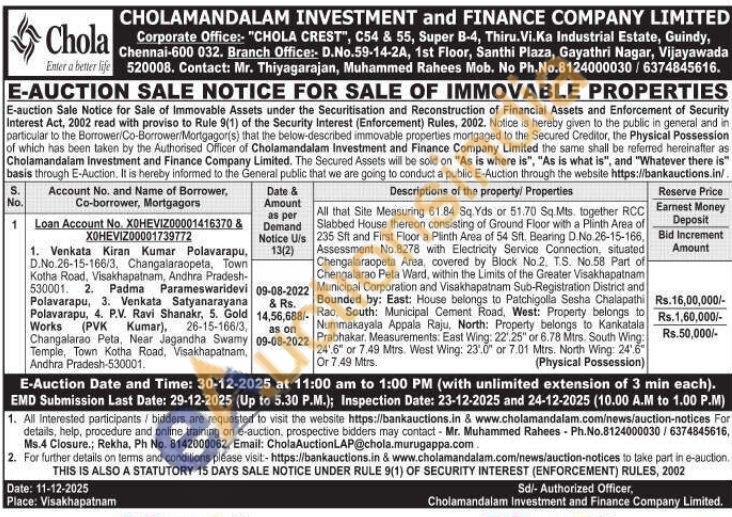 All that Site Measuring 61.84 Sq. Yds or 51.70 Sq.Mts. together RCC Slabbed House thereon consisting of Ground Floor with a Plinth Area of 235 Sft and First Floor a Plinth Area of 54 Sft. Bearing D.No. 26-15-166, Assessment No.8278 with Electricity Service Connection, situated Chengalaraopeta Area, covered by Block No.2. T.S. No.58 Part of Chengalarao Peta Ward, within the Limits of the Greater Visakhapatnam Municipal Corporation and Visakhapatnam Sub-Registration District and Bounded by: East: House belongs to Patchigolla Sesha Chalapathi Rao, South: Municipal Cement Road, West: Property belongs to Nummakayala Appala Raju, North: Property belongs to Kankatala Prabhakar. Measurements: East Wing: 22.25" or 6.78 Mtrs. South Wing: 24'.6 or 7.49 Mtrs. West Wing: 23.0" or 7.01 Mtrs. North Wing: 24.6" Or 7.49 Mtrs.