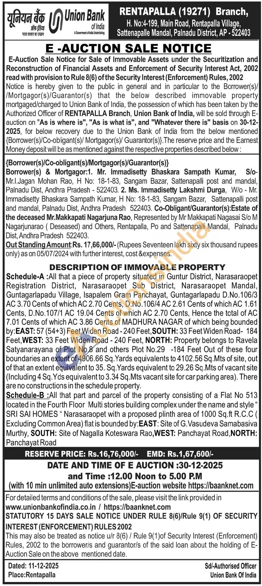 Schedule-A: All that a piece of property situated in Guntur District, Narasaraopet Registration District, Narasaraopet Sub District, Narasaraopet Mandal, Guntagarlapadu Village, Isapalem Gram Panchayat, Guntagarlapadu D.No.106/3 AC 3.70 Cents of which AC 2.70 Cents, D.No. 106/4 AC 2.61 Cents of which AC 1.61 Cents, D.No.107/1 AC 19.04 Cents of which AC 2.70 Cents, Hence the total of AC 7.01 Cents of which AC 3.86 Cents of MADHURA NAGAR of which being bounded by:EAST: 57 (54+3) Feet Widen Road-240 Feet, SOUTH: 33 Feet Widen Road-184 Feet, WEST: 33 Feet Widen Road - 240 Feet, NORTH: Property belongs to Ravela Satyanarayana of Plot No.8 and others Plot No.29 -184 Feet Out of these four boundaries an extent of 4906.66 Sq. Yards equivalents to 4102.56 Sq.Mts of site, out of that an extent equivalent to 35. Sq. Yards equivalent to 29.26 Sq.Mts of vacant site (Including 4 Sq. Yds equivalent to 3.34 Sq.Mts vacant site for car parking area). There are no constructions in the schedule property.