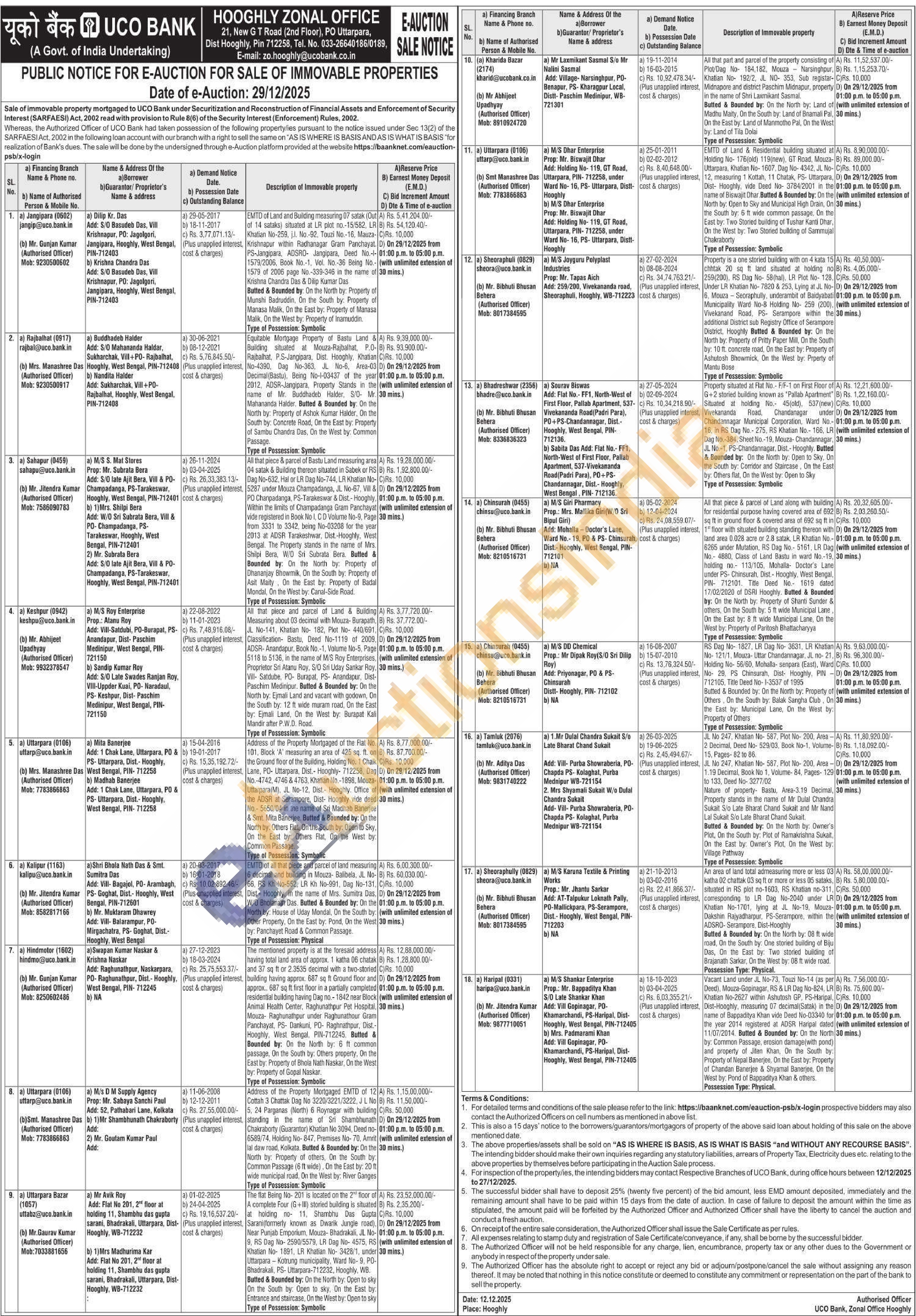 Property situated at Flat No.- F/F-1 on First Floor of G+2 storied building known as "Pallab Apartment Situated at holding No. 45(old). 537 (new) Vivekananda Road, Chandanagar under Chandannagar Municipal Corporation, Ward No.-16, in RS Dag No.- 275, RS Khatian No. 166, LR Dag No.-384, Sheet No.-19, Mouza- Chandannagar, JL No.-1, PS-Chandannagar, Dist.- Hooghly. Butted & Bounded by: On the North by: Open to Sky. On the South by: Corridor and Staircase, On the East by Others flat, On the West by: Open to Sky