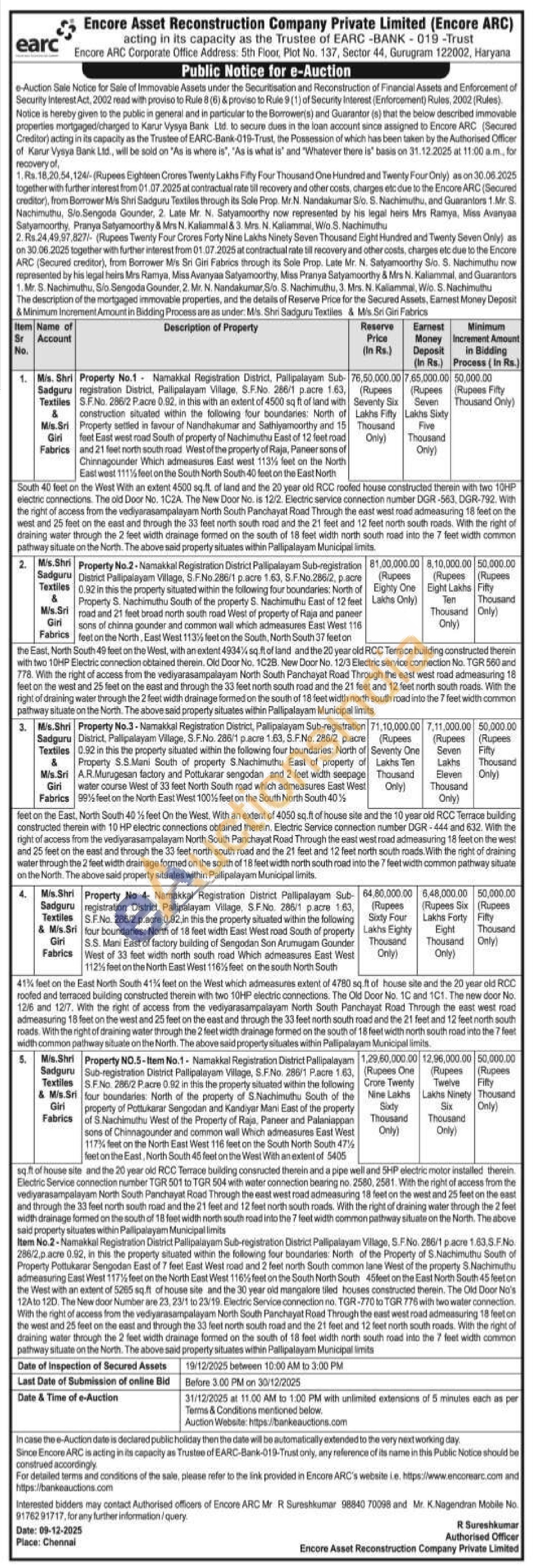 Property No.2-Namakkal Registration District Pallipalayam Sub-registration District Pallipalayam Village, S.F.No.286/1 p.acre 1.63, S.F.No.286/2, pacre 0.92 in this the property situated within the following four boundaries: North of Property S. Nachimuthu South of the property S. Nachimuthu East of 12 feet road and 21 feet broad north south road West of property of Raja and paneer sons of chinna gounder and common wall which admeasures East West 116 feet on the North, East West 113% feet on the South, North South 37 feet on the East, North South 49 feet on the West, with an extent 4934% sq.ft of land and the 20 year old RCC Terrace building constructed therein with two 10HP Electric connection obtained therein. Old Door No. 1C2B. New Door No. 12/3 Electric service connection No. TGR 560 and 778. With the right of access from the vediyarasampalayam North South Panchayat Road Through the east west road admeasuring 18 feet on the west and 25 feet on the east and through the 33 feet north south road and the 21 feet and 12 feet north south roads. With the right of draining water through the 2 feet width drainage formed on the south of 18 feet width north south road into the 7 feet width common pathway situate on the North. The above said property situates within Pallipalayam Municipal limits