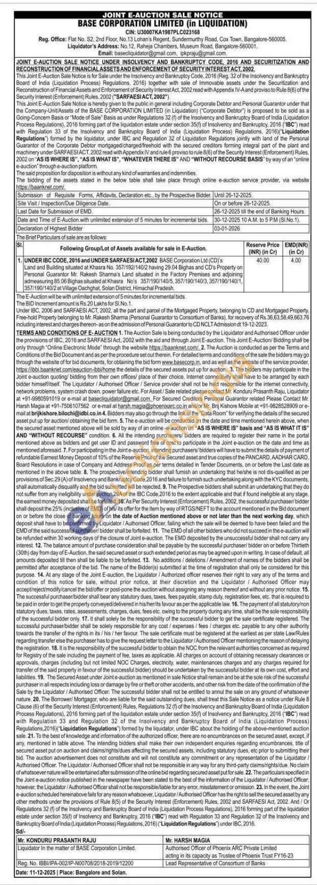 Land and Building situated at Khasra No. 357/192/140/2 having 29.04 Bighas and CD's Property on Personal Guarantor Mr. Rakesh Sharma's Land situated in the Factory Premises and adjoining admeasuring 85.06 Bighas situated at Khasra No's 357/190/140/5, 357/190/140/3, 357/190/140/1, 357/190/140/2 at Village Oachghat, Solan District, Himachal Pradesh.