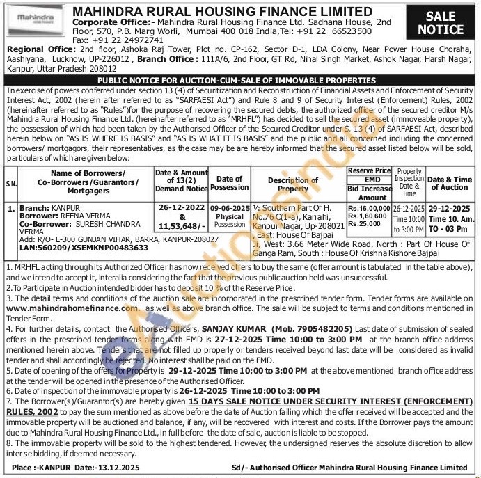 1/2 Southern Part Of H. No.76 C(1-a), Karrahi, Kanpur Nagar, Up-208021 East: House Of Bajpai 1 Ji, West: 3.66 Meter Wide Road, North Part Of House Of Ganga Ram, South: House Of Krishna Kishore Bajpai