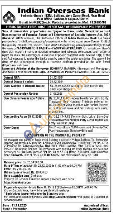 All that part and parcel of Residential Building situated in Village Bokhira, Tal. Porbandar Bearing Old Revenue Survey No. 42 (New Revenue Survey No. 1188) Paiki Plot No. 17 To 20PaikiPart No. A (City Survey No. NA1188/17 PAJKI) Land Sq. Mtrs. 53-53 of "Shri Lirbai Park-12" situated in Bokhira, Tal, Porbandar with existing structure thereon and bounded hereunder as On East-Land of Plot No. 48 to 52, On West-7.50 Mtrs, wide Common Road, On North-Land of Block No. B. On South-Land of Revenue Survey No. 1204