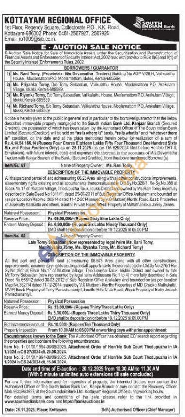 2) All that part and parcel of land admeasuring 06578 Ares along with all other constructions. improvements, easementary rights existing and all appurtenants thereon situated in Old Sy No. 276/1 Re-Sy No.182 at Block No.17 of Muttom Wilage, Thodupuzha Taluk, Idukki District and owned by late Mr. Tomy Sebastian (now represented by legal heirs Addressee No.1 to 4) more fully described in Sale Deed No.658/12 dated 30-03-2012 of Sub Registrar Office Arakulam and bounded on (as per location Mao No.382/14 dated 11-12-2014 issued by VD Muttom): North: Properties of MD Chacko Mathukat, MVIP, East: Property of Tomy Panachananiyil, South: Rife Club Road, West: Property of Baby Joseph Panachananiyll