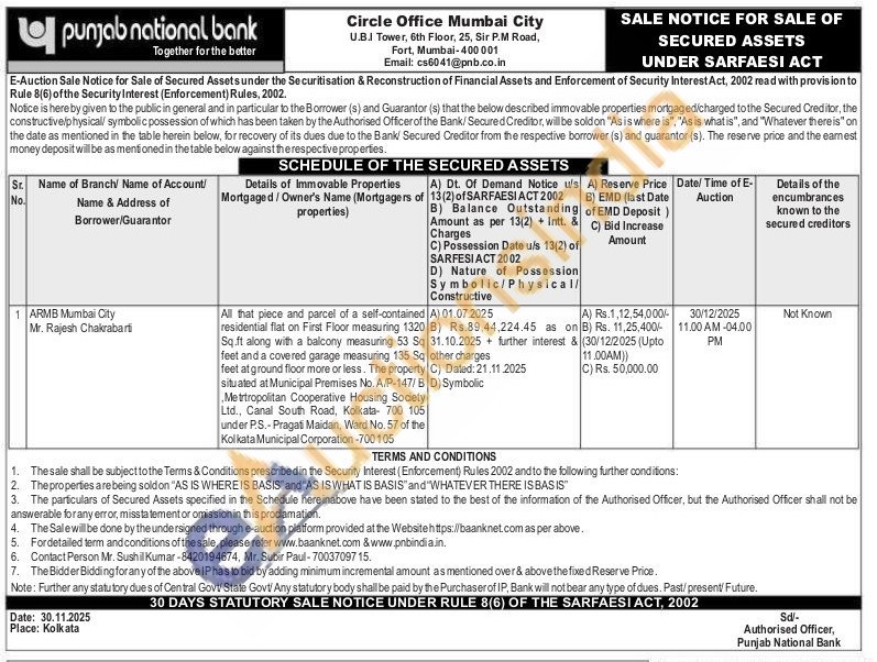All that piece and parcel of a self-contained residential flat on First Floor measuring 1320 Sq.ft along with a balcony measuring 53 Sq feet and a covered garage measuring 135 Sq feet at ground floor more or less. The property situated at Municipal Premises No. A/P-147/B Metrtropolitan Cooperative Housing Society Ltd., Canal South Road, Kolkata 700 105 under P.S.-Pragati Maidan, Ward No. 57 of the Kolkata Municipal Corporation-700105