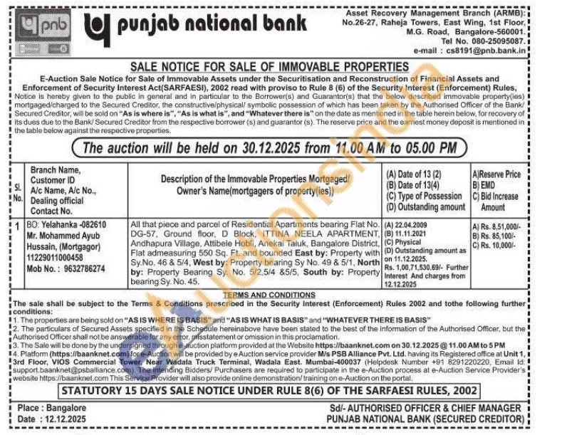 All that piece and parcel of Residential Apartments bearing Flat No. DG-57. Ground floor, D Block, ITTINA NEELA APARTMENT, Andhapura Village, Attibele Hobli, Anekal Taluk, Bangalore District, Flat admeasuring 550 Sq. Ft. and bounded East by: Property with Sy.No. 46 & 5/4, West by: Property bearing Sy No. 49 & 5/1, North by: Property Bearing Sy. No. 5/2.5/4 85/5, South by: Property bearing Sy. No. 45.