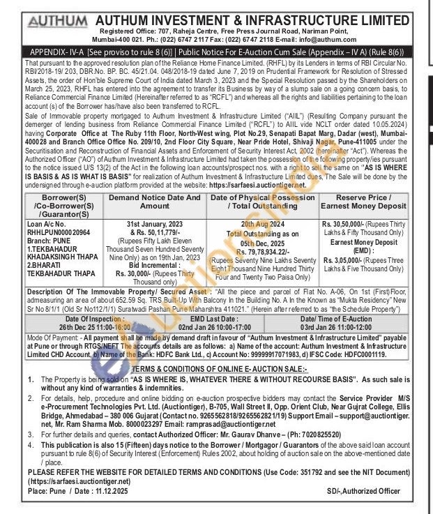Description Of The Immovable Property/ Secured Asset: "All the piece and parcel of Flat No. A-06, On 1st (First) Floor, admeasuring an area of about 652.59 Sq. TRS Built-Up With Balcony in the Building No. A In the Known as "Mukta Residency" New Sr No 8/1/1 (Old Sr No112/1/1) Suratwadi Pashan Pune Maharshtra 411021." (Herein after referred to as "the Schedule Property")