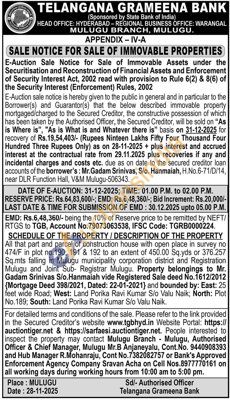 All that part and parcel of construction house with open place in survey no 474/F in plot no.190, 191 & 192 to an extent of 450.00 Sq.yds or 376.257 Sq.mts falling in Mulugu municipality corporation district and Registration Mulugu and Joint Sub- Registrar Mulugu. Property belongings to Mr. Gadam Srinivas S/o. Hanmaiah vide Registered Sale deed No.1612/2012 {Mortgage Deed 398/2021, Dated: 22-01-2021} and bounded by: East: 25 feet wide Road; West: Land Porika Ravi Kumar S/o Valu Naik; North: Plot No.189; South: Land Porika Ravi Kumar S/o Valu Naik