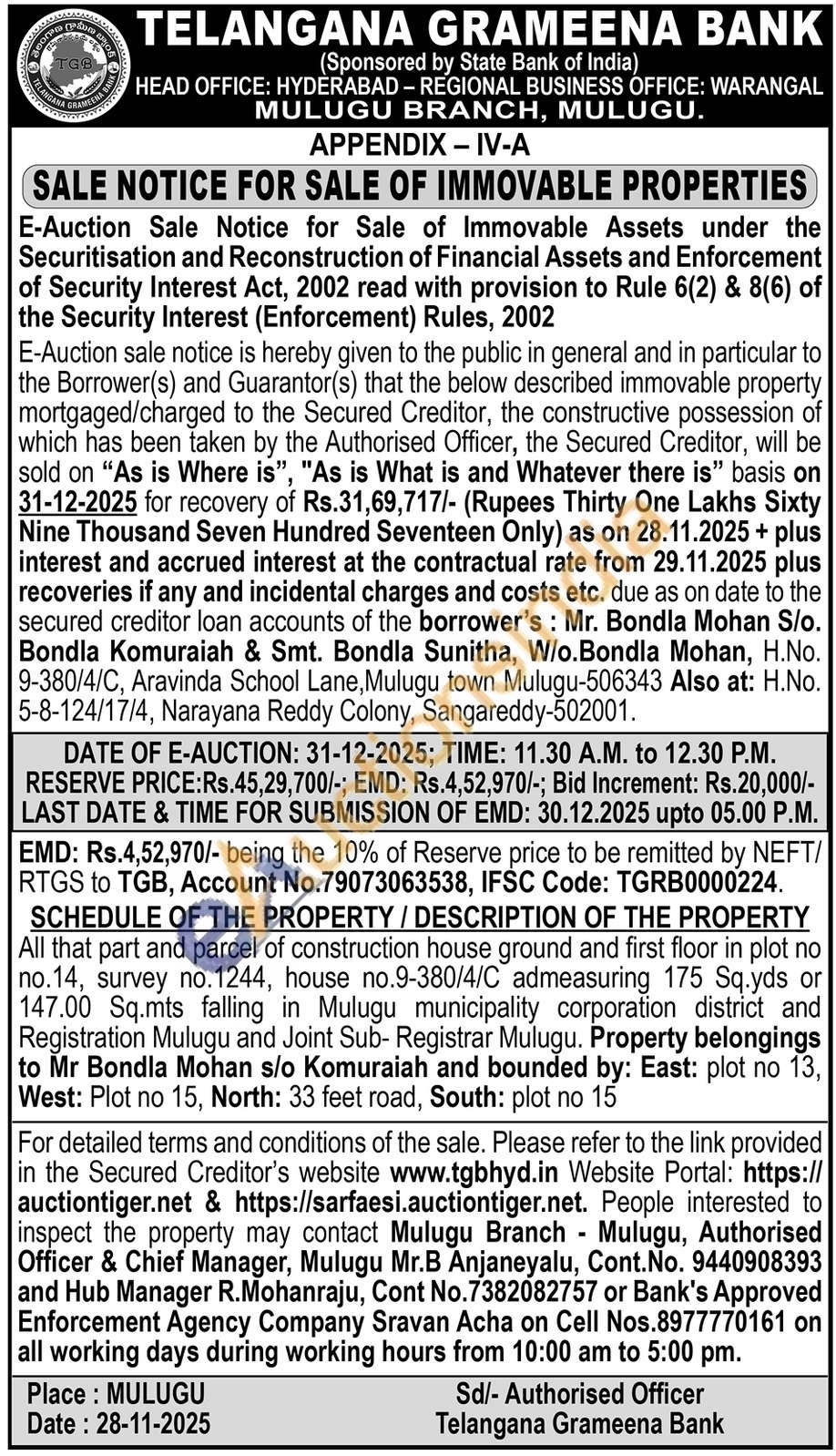 Authorised Officer & Chief Manager, Mulugu Mr.B Anjaneyalu, Cont.No. 9440908393