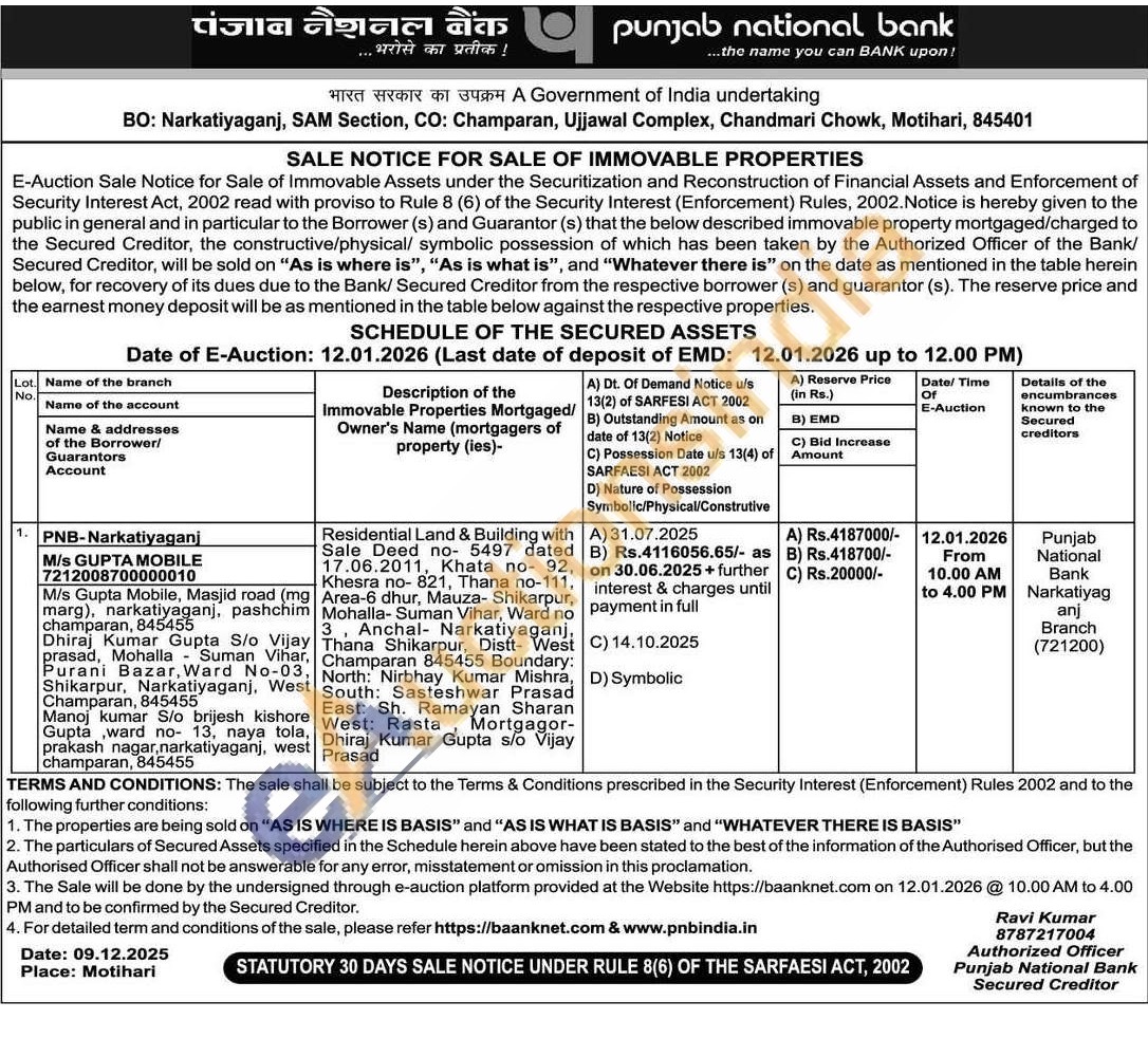 Residential Land & Building with Sale Deed no- 5497 dated 17.06.2011, Khata no- 92, Khesra no- 821, Thana no-111, Area-6 dhur, Mauza- Shikarpur, Mohalla-Suman Vihar, no 3 Anchal Narkatiyaganj, Thana Shikarpur, Distt- West Champaran 845455 Boundary: North: Nirbhay Kumar Mishra, South: Sasteshwar Prasad East: Sh. Ramayan Sharan West: Rasta Mortgagor-Dhiraj Kumar Gupta s/o Vijay Prasad