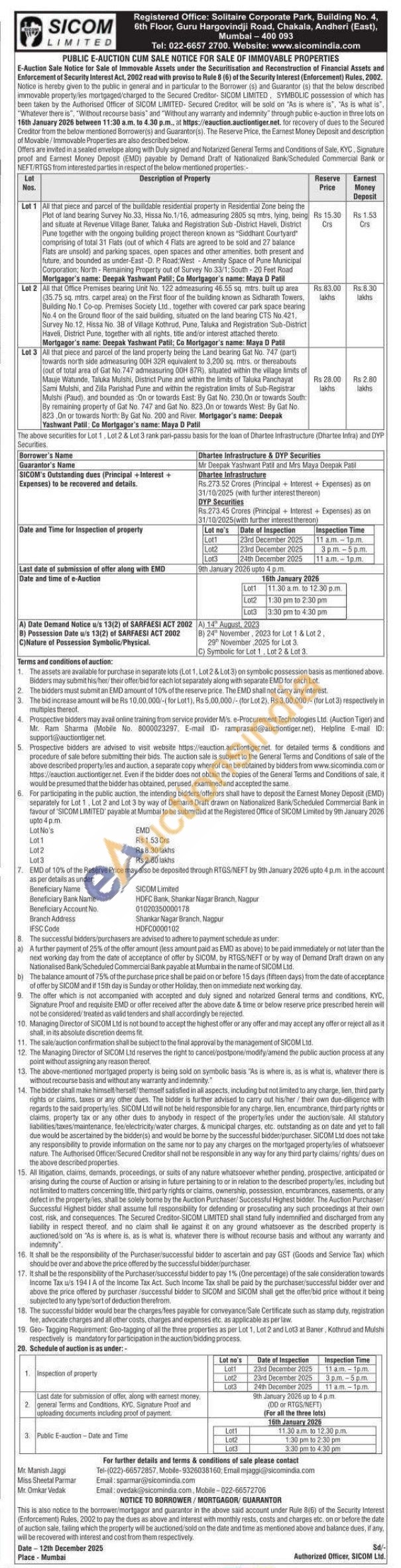 All that piece and parcel of the buildable residential property in Residential Zone being the Plot of land bearing Survey No. 33, Hissa No. 1/16, admeasuring 2805 sq mtrs, lying, being and situate at Revenue Village Baner, Taluka and Registration Sub-District Haveli, District Pune together with the ongoing building project thereon known as "Siddhant Courtyard comprising of total 31 Flats (out of which 4 Flats are agreed to be sold and 27 balance Flats are unsold) and parking spaces, open spaces and other amenities, both present and future, and bounded as under-East-D. P. Read West Amenity Space of Pune Municipal Corporation, North-Remaining Property out of Survey No. 33/1: South-20 Feet Road Mortgagor's name: Deepak Yashwant Patil: Co Mortgagor's name: Maya D Patil