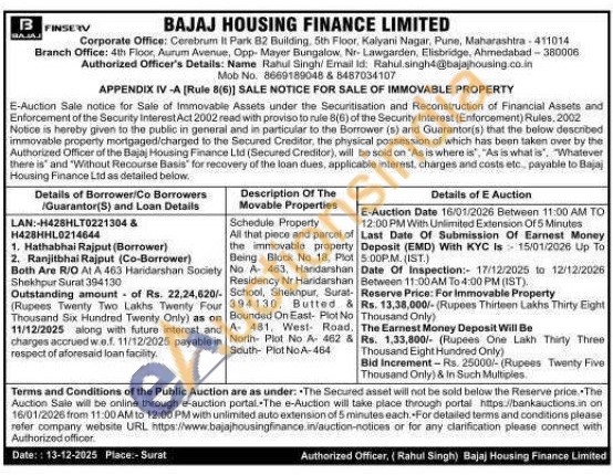 Schedule Property All that piece and parcel of the immovable property Being Block No 18. Plot No A 463, Handarshan Residency Nr Haridarshan School, Shekhpur, Surat-394130, Butted & Bounded On East- Plot No A 481, West Road. North Plot No A- 462 & South Plot No A-464