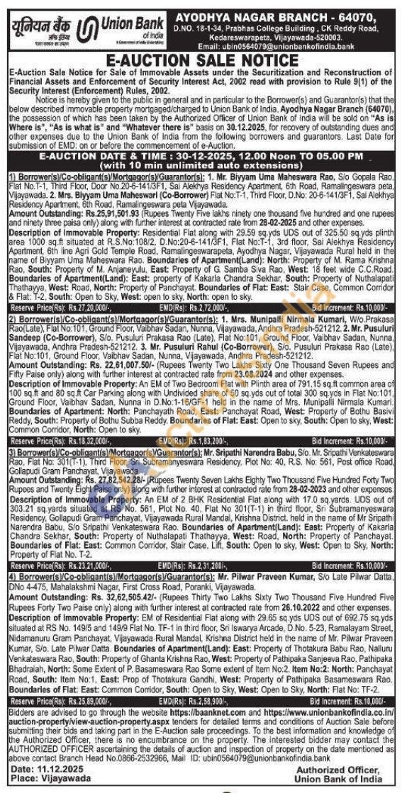4) EM of Residential Flat along with 29.65 sq.yds UDS out of 692.75 sq yds situated at RS No. 149/5 and 149/9 Flat No. TF-1 in third floor, Sri Iswarya Arcade, D.No. 5-23, Ramalayam Street, Nidamanuru Gram Panchayat, Vijayawada Rural Mandal, Krishna District held in the name of Mr. Pillwar Praveen Kumar, Sio. Late Pilwar Datta. Boundaries of Apartment(Land): East: Property of Thotakura Babu Rao, Nailuru Venkateswara Rao, South: Property of Ghanta Krishna Rao, West: Property of Pathipaka Sanjeeva Rao, Pathipaka Bhadraiah, North: Some Extent of P. Basameswara Rao Some extent of Item No:2. Item No:2: North: Panchayat Road, South: Item No:1, East: Prop of Thotakura Gandhi, West: Property of Pathipaka Basameswara Rao. Boundaries of Flat: East: Common Corridor, South: Open to Sky, West: Open to Sky, North: Flat No: TF-2.