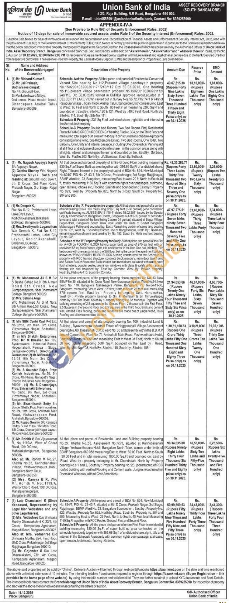 1)All that piece and parcel of Residential Converted Vacant Site bearing No. 112. Present village panchayath property No. 150200103200201171/240/112 Did 30.03.2015. Site bearing No. 113, present village panchayath property No. 150200103200201172/240/113, Did 30.03.2015 formed in BMRDA approved layout situated at " CELEBRITY LAKE VIEW carved out in Survey Nos 56,72,73/2,74/1 & 74/2 of Rajapura Village, Jigani Hobli, Anekal Taluk, bangalore District measuring East to West: 65 Feet and North to South: 80 Feet in all measuring 5200 Sq Ft and bounded on: East By: Site No. 120 & 121, West By: 40.0 Feet Road, North By: Site No. 114, South By: Site No. 111. Schedule-B Property: 231 Sq Ft of undivided share, right, title and interest in the Schedule Aproperty. Schedule-C Property: Double bed Rooms Two Bed Rooms Flat) Residential Flat at MIYANS GREEN RESIDENCY bearing Flat No.304, on the Third floor and measuring total super built area of 1145 Sq Ft constructed on schedule-A property consisting of one living, one Kitchen, one Dining. Two Bed Rooms, One Toilet, Two Balcony, One Utility and Internal passage, including One Covered car Parking slot at stilt floor and inclusive of proportionate share in the common areas along with all rights, interest and privileges thereon and bounded on the East By: Set back, West By: Flat No.303, North By: Lift/Staircase, South By: Set back