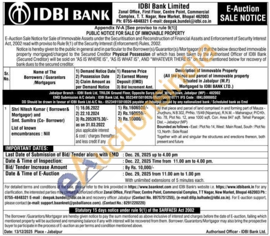 All that piece and parcel of land comprised in and forming part of Mauza - Jhurjhuru, NB 302, PHNo. 15:49 (Nipaniya), R.N.M.-Maharajpur, P/O Kh. No. 78, Plot No. 12, area 1000 sqft. Con. Area 847 sqft. Tehsil Panagar, Dist.-Jabalpur (MP) Bounded as follows-East: Plot No 14, West: Main Road, South: Plot No 13. North: Side Road Together with all and singular the structures and erections thereon, both present and future